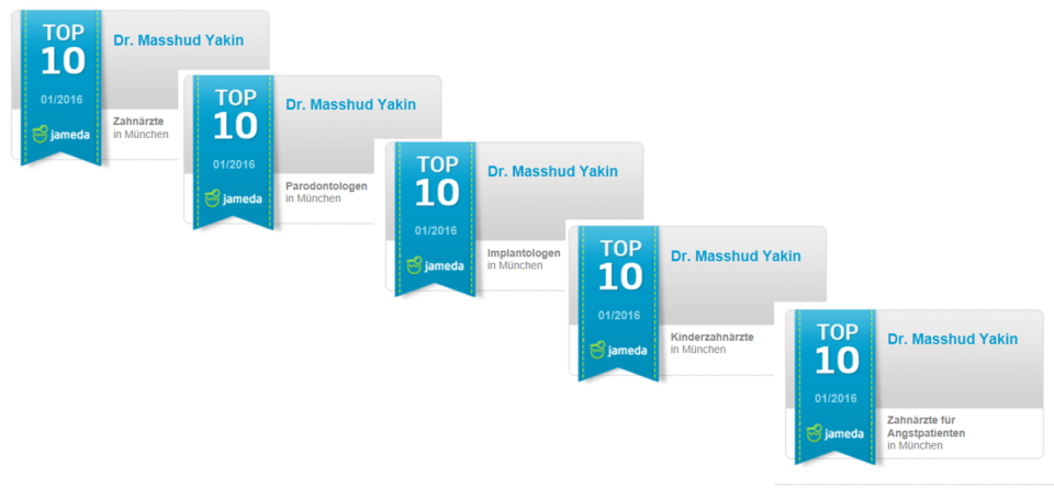 All unseren Patienten, die sich so viel Zeit für die umfangreichen und tollen Bewertungen genommen haben, ist dies zu verdanken: die Zahnarztpraxis Dr. Yakin im Ärztehaus Nymphenburg wurde unter die Top 10 der Münchner Zahnarztpraxen gewählt, was bei der Fülle an Zahnärzten in München nicht ganz einfach ist.
